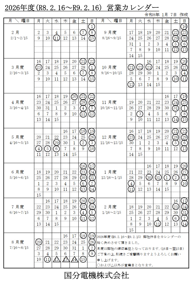 2026年度営業カレンダー 2026/2/5 トピックス 2026年度(R8.2.16~R9.2.15)営業カレンダーが決まりました。〇および△以外が営業日となります。 2026_Calendarダウンロード